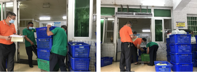 【卯时】5:00-7:00 第一缕阳光洒进校园, 校园慢慢开始苏醒。 新鲜的食品原材料送到了食堂, 为制作师生的午晚餐做好准备。 食堂师傅有序地清点食材数量, 高标准严格检验食材质量, 保证食品原材料新鲜。