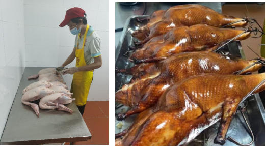 经验老到的师傅将新鲜鸭子腌制入味的, 经过打气、挂钩、烫皮、风干等复杂工序, 最后推入烤炉烤制。 行云流水的动作间, 新鲜出炉的烧鸭已经挂在了售卖窗前, 一刀下去,满目流油,皮脆肉嫩。
