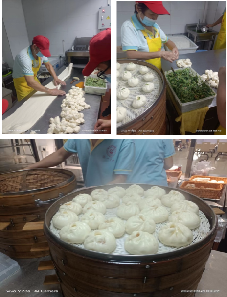 刚刚醒好的面团被放进压面机中, 反复压8-10次,使面团成为结实的面饼, 迅速完成叠、压、搓、揉等繁杂的步骤, 放入提前打好的肉馅,最后蒸煮。 半个小时后,热气蒸腾而出, 食堂师傅的衣服被汗水浸湿, 而蒸腾而出的热气散发出浓浓的香甜, 味沁人心脾,让人瞬间有了饥饿感。 食堂的烟火气里氤氲着温暖与爱, 元气满满的一天开始了。