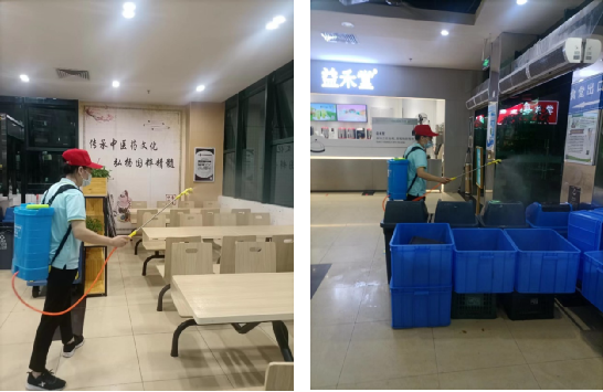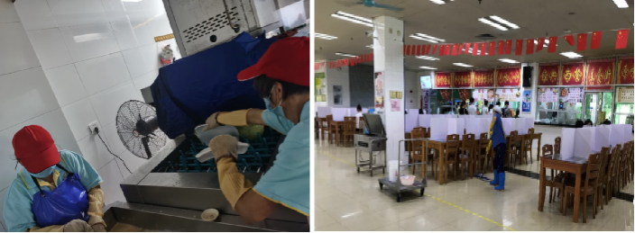 【亥时】21:00-23:00 人定月胧明。 食堂的灯光还未熄灭, 工作人员正做着一天最后的消杀工作, 为守护美丽和谐校园负重前行。