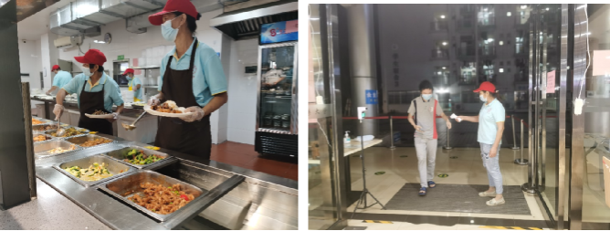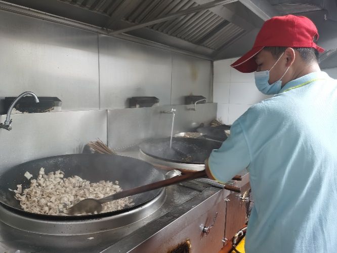 【酉时】17:00-19:00 一抹轻飘飘的晚霞跃入眼帘, 晚饭时间到了。 食堂再度熙熙攘攘起来, 食堂阿姨在大门处值守, 提醒每位同学测温亮码,佩戴口罩。 每个售卖窗口前排着长长的队伍, 售卖窗口的阿姨有条不紊的出餐。  【戊时】19:00-21:00 月上柳梢头,晚风醉人心。 晚餐过后的饭菜余味尚存, 食堂的工作却还未结束。 师傅们忙着制定第二天的菜式, 根据菜式下单订购原材料, 为第二天的工作做好准备。