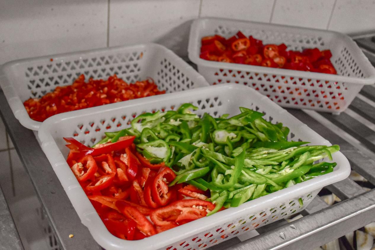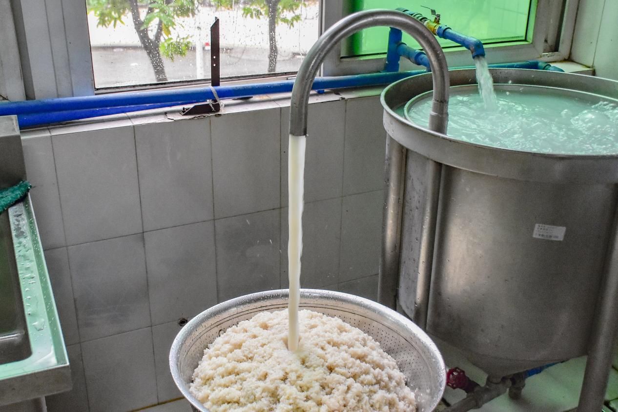 忙完“外头”的工作,林经理来到了食堂后厨——食材加工区。在蔬菜区,一筐筐的蔬菜送了进来,阿姨们麻利地清洗干净,手起刀落间,蔬菜就已经被均匀地切成一片片一段段一块块。在米饭区里,借助大型淘米工具,一桶桶大米被清洗干净后放进蒸饭箱里,为学生提供了足量的碳水。