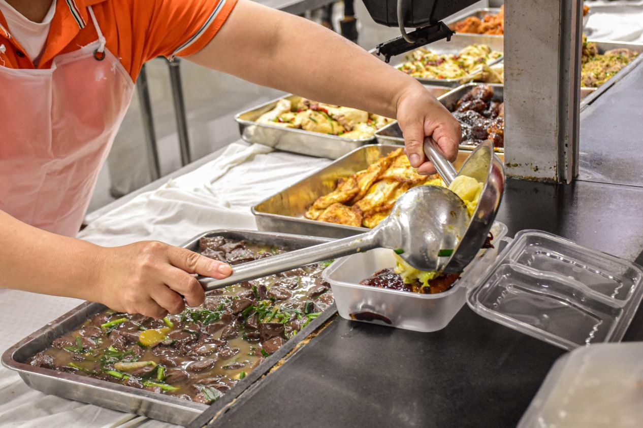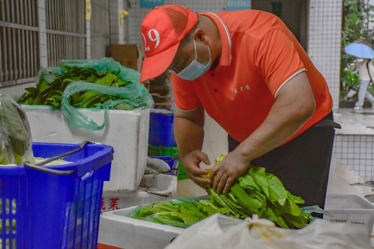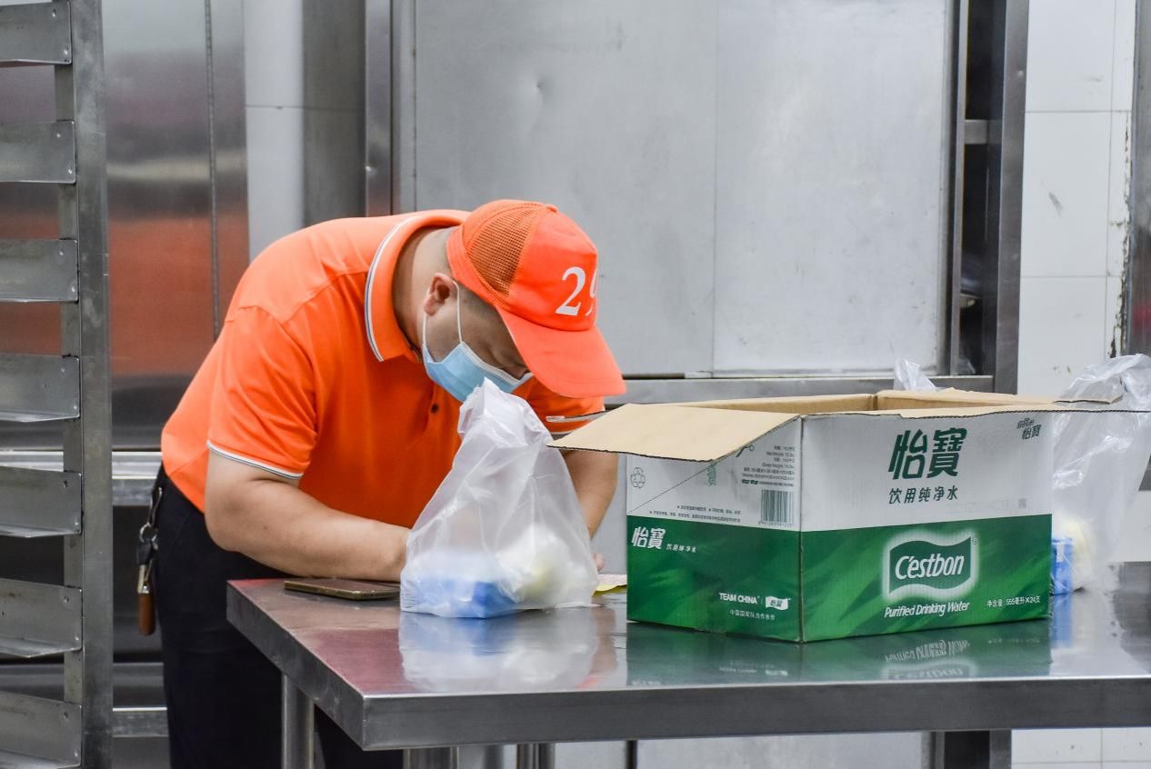完成食材验收工作后,林经理来到了档口协助打菜。清洗双手,戴上口罩,穿上工作服,摇身一变,成了打菜人。当日二饭需要给在校隔离的学生准备早餐,林经理熟练地把食物准备好,贴上标签,及时为隔离学生送上热气腾腾的早饭。送完早餐,他还不忘嘱托打菜的阿姨,正在隔离的学生不容易,今天午餐和晚餐给学生多添些菜。