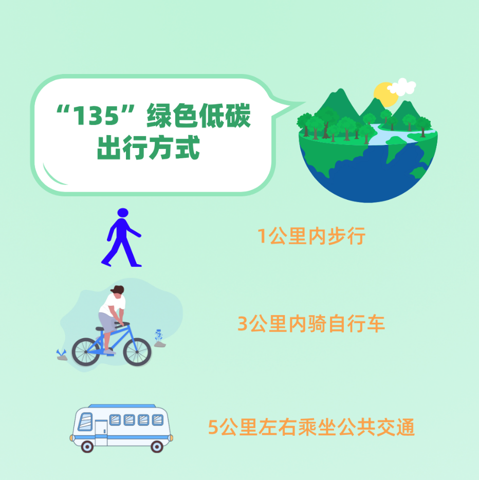 让我们积极采用节约能源、提高能效、减少污染、有益健康、兼顾效率的绿色出行方式,坚持做到绿色低碳出行“135”,即: