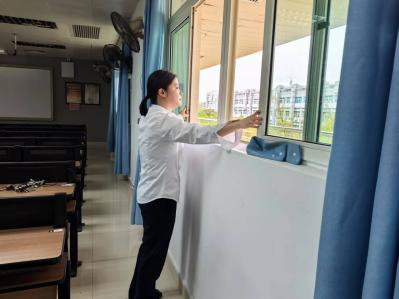 提前对考场、走廊、楼梯、卫生间等区域进行全面清洁,清除灰尘和垃圾等。考前对考场的桌面、座椅、门把手等高频接触部位进行消毒;考试期间安排专人定时清理卫生间,及时补充卫生纸、洗手液等用品,保持卫生间干净无异味;考后及时清运考场周边及内部垃圾,保持环境整洁。